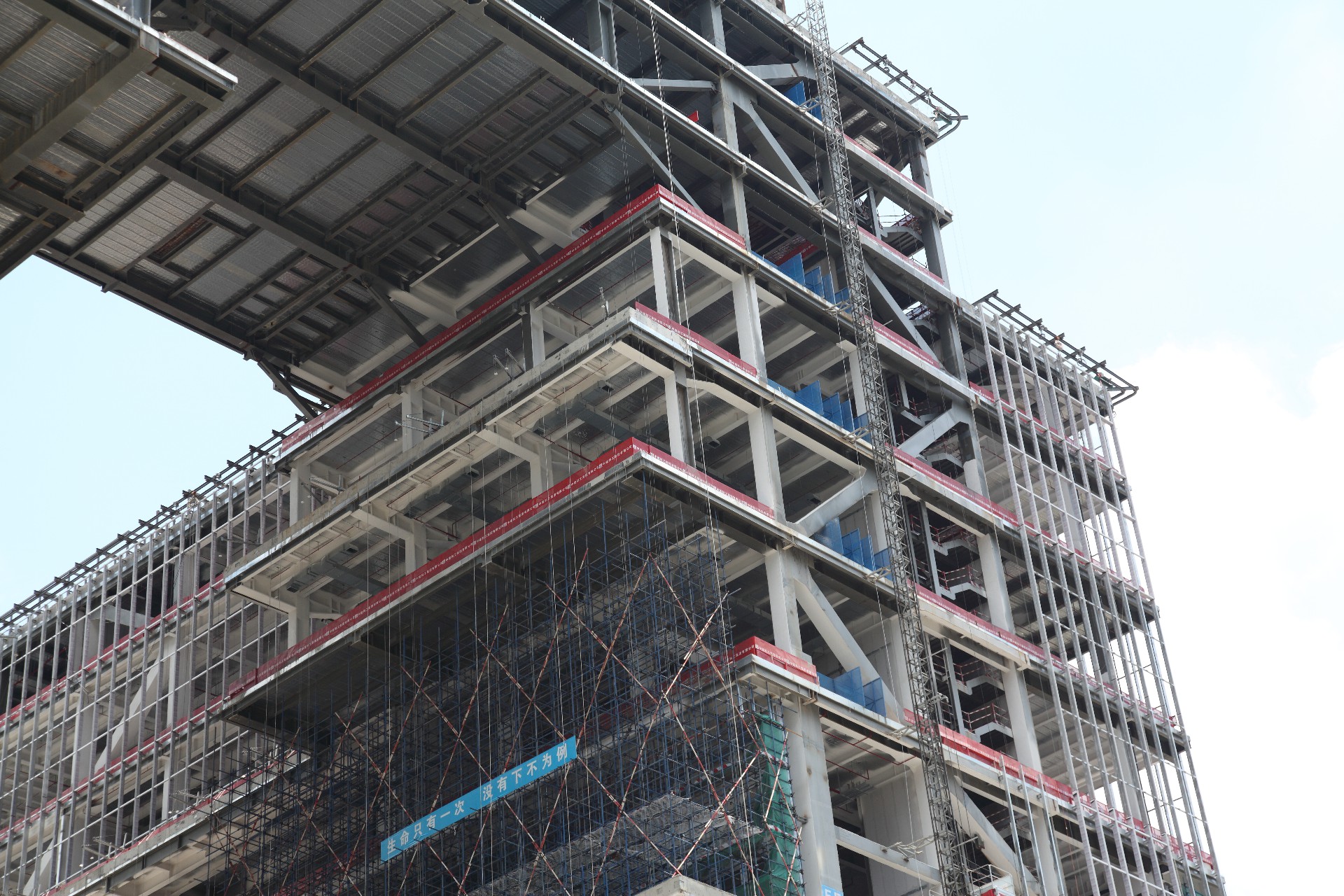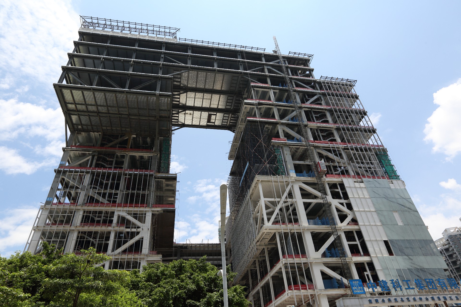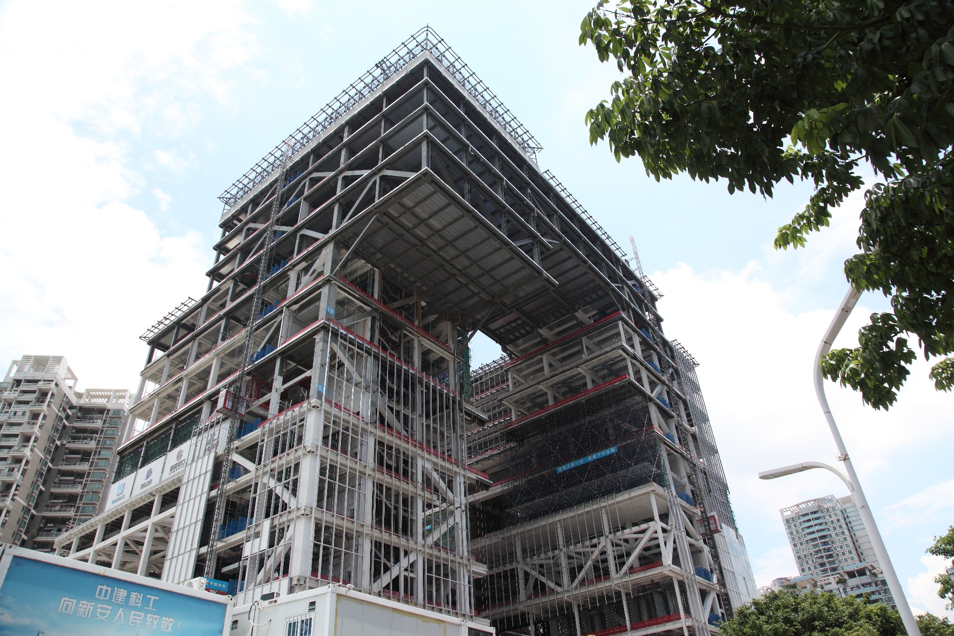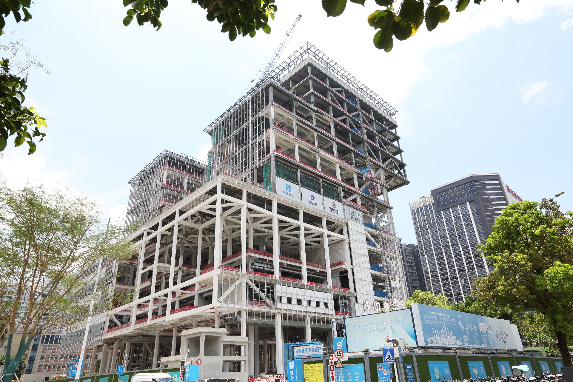 深圳宝安公共文化中心项目三馆合一大型公共文化建筑,占地面积1.43万平方米,建筑面积92125平方米;最跨度大,单跨达34.8米,悬挑最大长度17.4米,建筑高度99.9米,地上12层,地下3层。用钢量:6080吨。